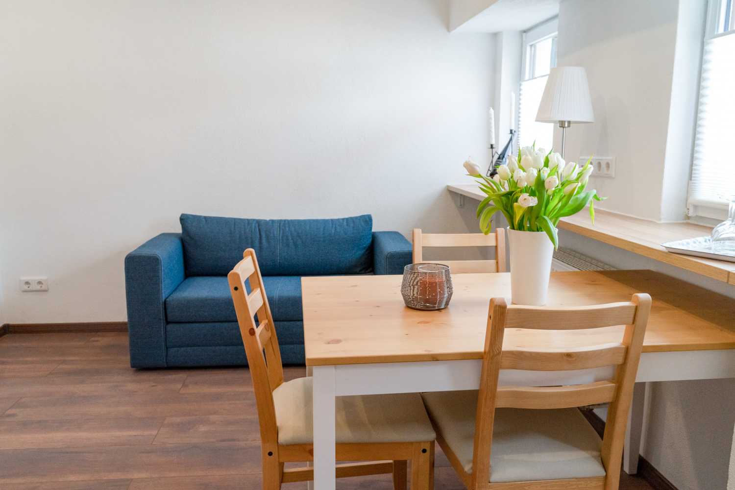 Das Apartment verfügt darüber hinaus noch über eine kleine Sitzecke mit Sofa und Esstisch sowie eine gut ausgestattete Kochnische mit Herd, Backofen und Kühlschrank.